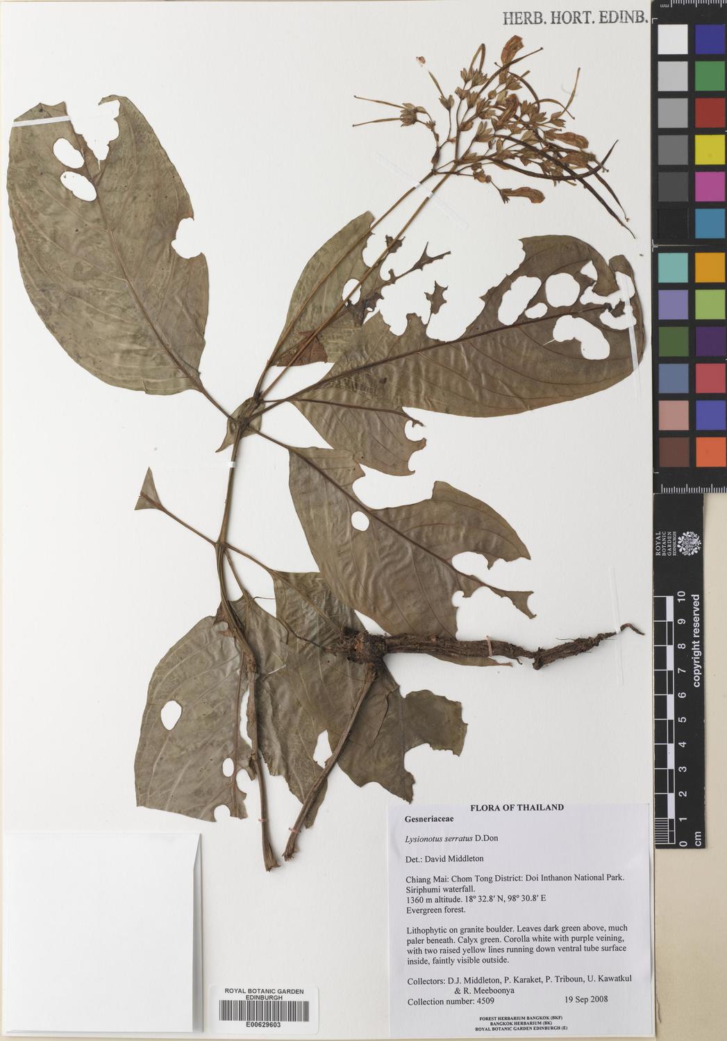 Lysionotus serratus D. Don, Edinburgh Philos. J. 7(13): 86 1822. (Syn: Calosacme polycarpa Wall.; Chirita polycarpa Steud. [Invalid]; Chirita ternifolia Buch.-Ham. ex D.Don [Invalid]; Hemiboea himalayensis H. Lév.; Lysionotus himalayensis (H. Lév.) W.T. Wang & Z.Y. Li; Lysionotus serratus var. serratus ; Lysionotus ternifolius Wall.); . D. Don in Edinb. Phil. Journ, vii. 85, and Prodr. 124 ; leaves elliptic acuminate crenate-serrate or lanceolate herbaceous sinuate, sepals narrowly lanceolate thin. Bot. Mag. t. 6538. L. ternifolia, Wall. Pl. As. Rar. ii. 20, t. 118 ; A. DC. Prodr. ix. 264 ; Clarke Comm. & Cyrt. Beng. t. 52. Calosacme polycarpa, Wall. Cat. 804. SUBTROPICAL HIMALAYA, alt. 2-7000 ft. ; from Kumaon to Bhotan, common, Wallich, &c. ASSAM and KHASIA MTS., alt. 1-4000 ft., common. Stem 12 in., branched. Leaves often ternate, 6 by 2 in., from narrow-lanceolate to elliptic, closely serrate nearly to the base or sinuate ; nerves prominent, oblique ; petiole 1/3 in. Peduncles often 4 in. ; bracts 1/3 in., ovate ; pedicels 1/4-1/2 in. Sepals 1/4 in., in young fruit often enlarged 1/3-1/2 in. and somewhat connate at the base. Corolla 1 in., deep purple or paler, or white with purplish veins. Capsule 2-4 in.