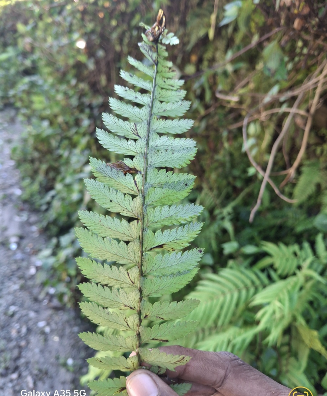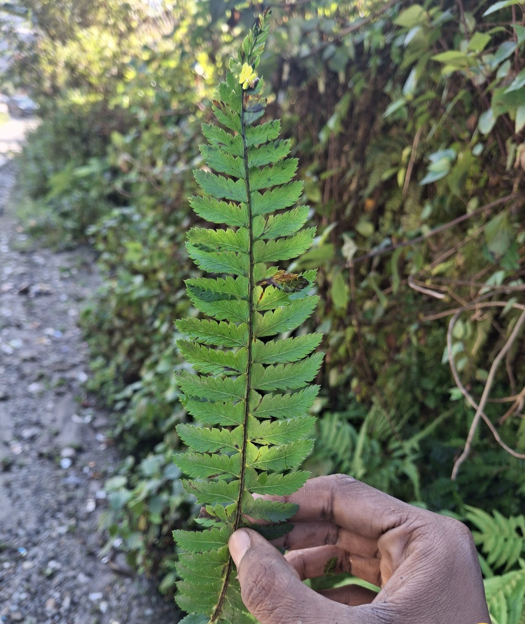 Polystichum lentum (D.Don) T.Moore, Index Fil.: 86 (1858) (syn: Aspidium auriculatum var. lentum (D.Don) C.B.Clarke; Aspidium auriculatum var. subpinnatum Hook. ; Aspidium lentum D.Don; Aspidium ocellatum Wall. ex Mett. ; Polystichum auriculatum var. lentum (D.Don) Bedd.; Polystichum auriculatum var. subpinnatum (Hook.) Bedd. ; Polystichum chunii Ching ; Polystichum lentum var. bifurcatum M.C.Biswas & Soumen K.Basu ; Polystichum longipes Ching & S.K.Wu ; Polystichum medogense Ching & S.K.Wu ; Polystichum ocellatum Schott ; Polystichum panigrahianum Sarn.Singh ; Polystichum sublentum Sarn.Singh & Panigrahi );
